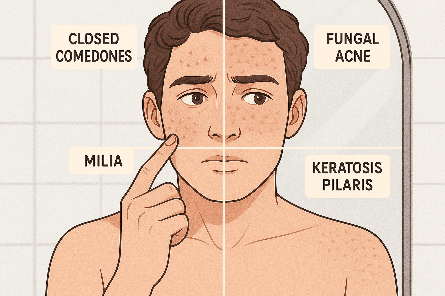 1. How do I know if my bumps are acne or something else?Acne is usually inflamed, oily, or painful, whereas lookalikes like fungal acne, milia, and keratosis pilaris have distinct patterns such as itching, firmness, or rough texture. Identifying the texture, location, and behaviour helps differentiate them. 2. What does fungal acne look like?Fungal acne appears as small, uniform, itchy bumps often in clusters on the forehead, hairline, chest, or back. It doesn’t respond to acne treatments and usually requires antifungal care. 3. Why won’t my closed comedones go away even with acne products?Closed comedones can persist due to occlusive skincare, dead skin buildup, or improper exfoliation. If bumps don’t improve after 6–8 weeks, they may not be closed comedones at all, but fungal acne, milia, or KP. 4. Can I pop or extract milia at home?No — milia are hard keratin cysts located under the skin and cannot be popped. Only a dermatologist or aesthetician can safely extract them. 5. What’s the best way to treat keratosis pilaris (KP)?KP responds best to moisturisers with urea, lactic acid, or glycolic acid. Consistent gentle exfoliation helps, while acne spot treatments will not improve KP.